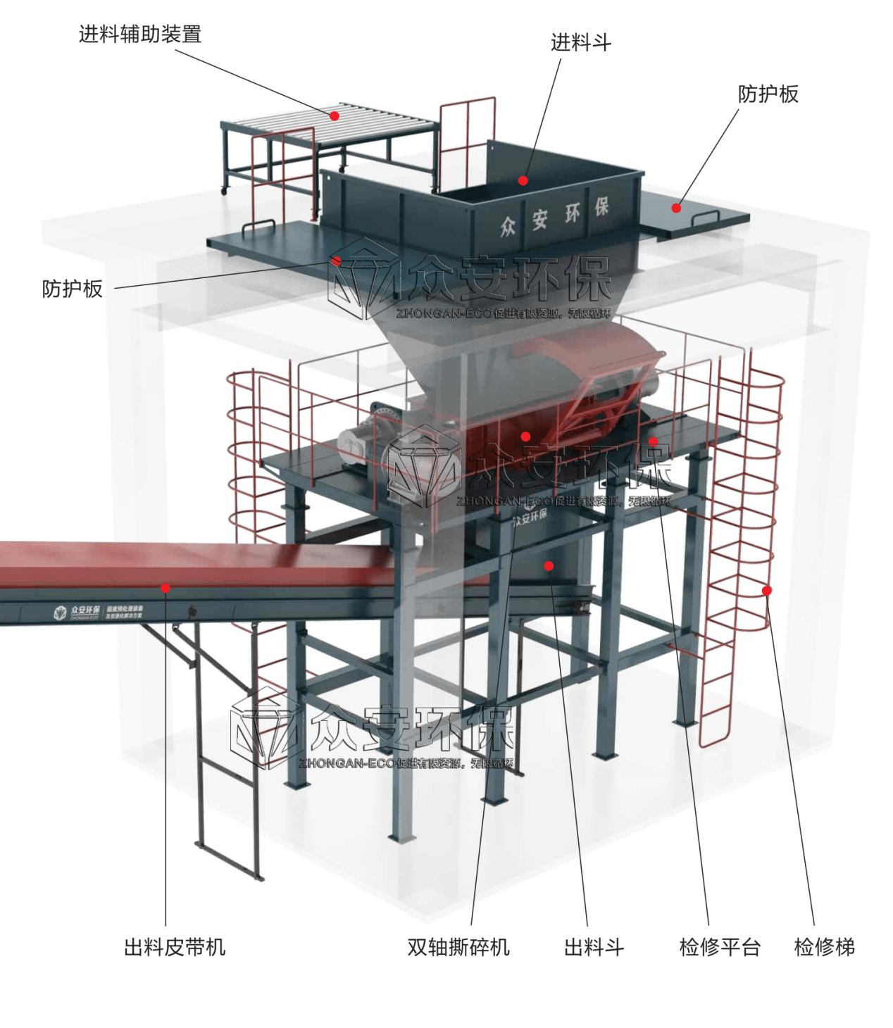 眾安環(huán)保大件垃圾處置系統全程密封結構,可以配合負壓除塵設計,能夠抑制大件垃圾破碎時(shí)粉塵外溢,實(shí)現清潔生產(chǎn)。